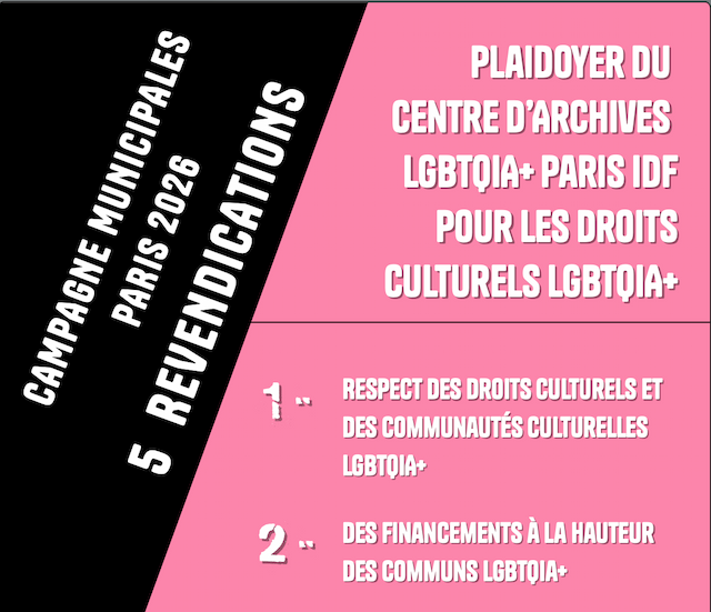 Géré de façon autonome et communautaire par le Collectif Archives LGBTQI+, association loi 1901 créée à l'initiative d'Act Up-Paris en 2017, le Centre s'oppose aux dynamiques de dépossession, de capture et d'invisibilisation qui privent les personnes LGBTQI+ de leur histoire et démocratise la collecte, la production et la consultation d'archives. En favorisant la multiplicité des récits et des expériences ainsi que la diversité des formes possibles d'archives, il assure aux générations actuelles et futures des ressources pertinentes pour leurs vies.